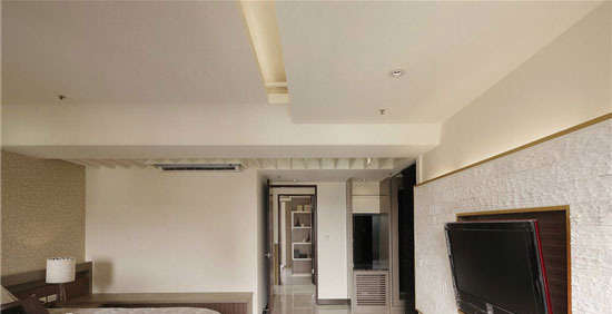 主卧在主墙面部分以凿面文化石壁纸阐述自然气韵,天花透过层次设计掩去原建筑物的梁柱,间接光源的铺设更将光影与空间的层次关系围塑完整。