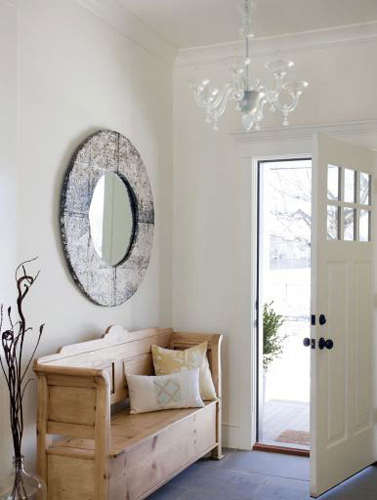 小编的话:在墙面上挂放上一面独特的圆形镜面不但可以在平日生活中体现出镜面的实用性,还能为整个玄关空间作墙面装饰用,而原木色木质双人换鞋座椅更是这一玄关的特色之作,在匆忙的早晨,至少不用因为没地方坐着换鞋而纠结影响了一整天的美好心情。