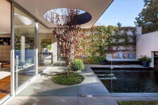 编辑点评:青灰色地砖围合的水池强调了人与自然和谐交流,绿色植被形成的绿化墙,挖空天花板只为树向上生长彰显设计师的匠心,巧妙打造出“家似陶然居”的意蕴。
