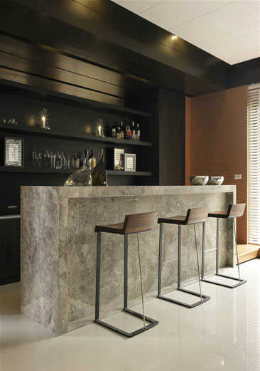 以安格拉珍珠大理石仿古面处理的吧台,可在温润抚触中品尝美酒,卸下一身疲惫。而黑色与灰色的搭配,也显示出主人非凡的品味。