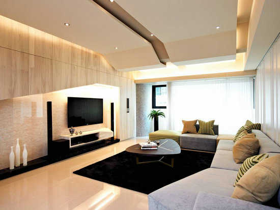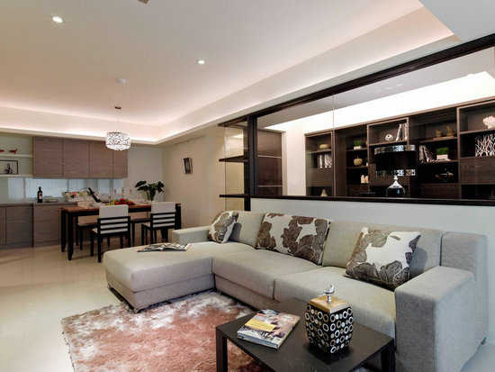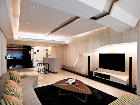 编辑点评:不对称的几何设计感延伸至沙发,,连天花板处亦以切割的几何线条搭配光影修饰低矮梁柱,尚扬理想家以延伸的不规则放射线条再度放大空间视感。