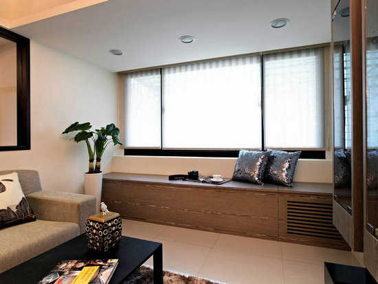 编辑点评:不对称性的采光下尚扬理想家利用窗下畸零,做入收纳与展列柜体,发挥空间坪效的最大值。