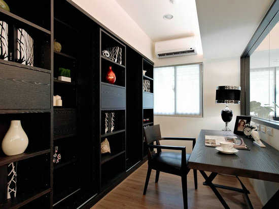 编辑点评:期待一间可沉静心灵的书房,是屋主对于空间的要求,木色舒压下辅以双层书柜量体,卷帘空间的预留让空间可互动、可独立。