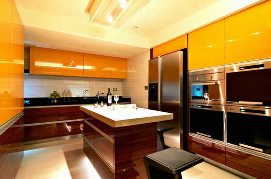 编辑点评:陈元旻设计师以高彩度的橘黄色烤漆与玫瑰木对花,缤纷下厨时的心情。