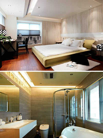 编辑点评:纹路立体的实木地板与浅色木作墙面晕染主卧室内敛人文氛围。设计师更在主卫浴使用玻璃砖,让窗外光源也能引进室内。