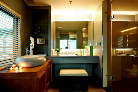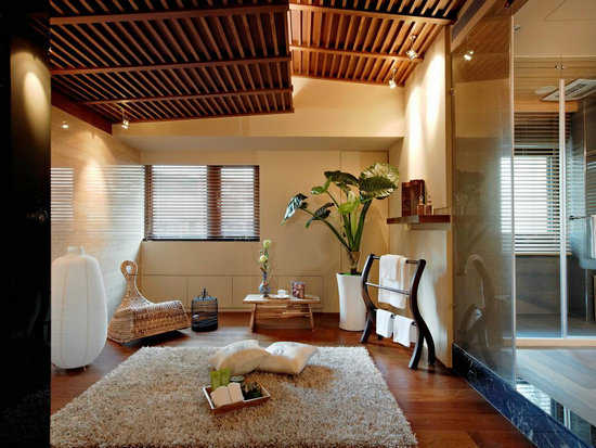 编辑点评:陈元旻设计师分别以柚木、香杉及木纹砖完整空间氛围,并在天花处以不对称的木作斜屋顶打造纯正泰式villaSPA况味。