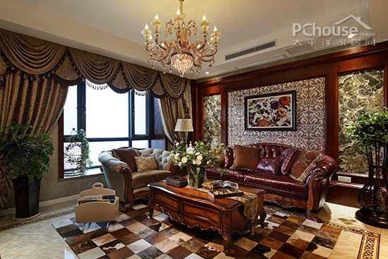 编辑点评:客厅呈现的是全景的深色调气质,美式中带有浓郁的女性气息,女主人的爱好和设计师的品格相得益彰。无论是顶部华丽吊灯,还是地面铺设地毯,每件陈设都精致唯美。