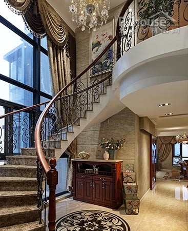 编辑点评:旋转着的楼梯,灵巧而充满着优雅。低调奢华的水晶灯点亮着这片令人陶醉的区域,莹莹的灯光让人心生家的渴望。木依然发挥着它的作用,浅浅的,暖暖的让家温暖起来。