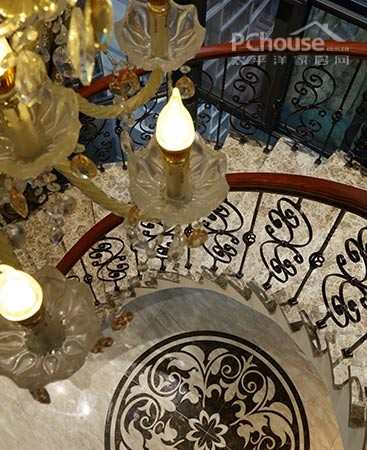 拾阶而上的空间是另一个未知,而通往二楼的这个转弯的楼梯空间,却正在表现着一种美丽。灵动的铁艺栏杆沿阶而上,宛然音乐的符号跳跃着,丰富着,撞击着每个抚摸而上的人。精心设计的大理石拼花让地面流淌出一种新的希望,生机勃勃,正好与楼梯旋转中心契合。