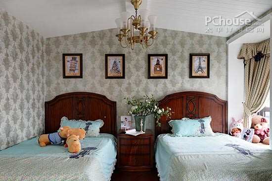 编辑点评:主人的双生宝贝卧室,处处体现着这个家庭的温暖,所有的物件在设置上都考虑到双份的设计,无论家具还是床品都写满了浓浓的爱意。