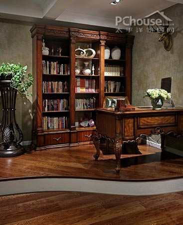 编辑点评:书房是充分利用二楼角落的空间而成,采用落地差的设计,让开放式的书房形成了自己独有的区域。一如既往的深色调预示着家的整体性和女主人的无上挚爱。