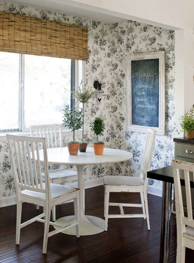 小编的话:墙壁上挂张小黑板,写着每日菜单,温馨提示,颇富生活气息。此外,搭配黑色印花墙纸,温馨浪漫,可感受到浓浓的爱意。