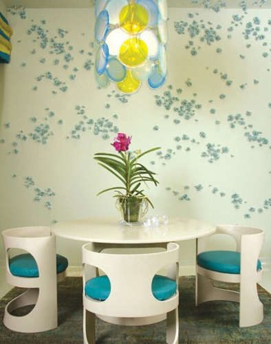 小编的话:圆形白色小餐桌与可爱的椅子相配,墙面上零星的天蓝色立体小花瓣点缀于白色墙面上,与椅子上的蓝色很搭,塑料圆形鳞片以对比色呈现,在灯光的映衬下显得通透明亮。