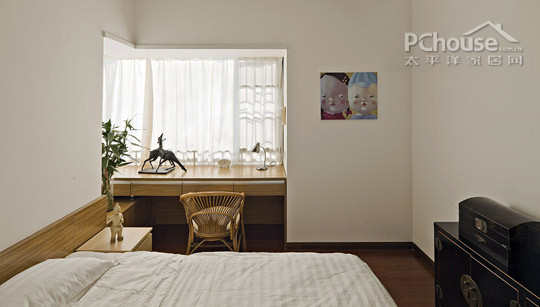 彭征在墙壁的转角处设计了窗户和书桌,一方面给空间引进阳光,另一方面也是活用了空间死角,让这个儿童房依旧宽敞明亮。原木地板和藤椅给空间增添了自然淳朴的气息。