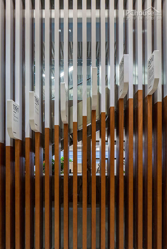 在通向二楼的楼梯间,由墙壁间伸展出来的白色木牌,按照年代排列介绍了华歌化学研发历史及所获殊荣。