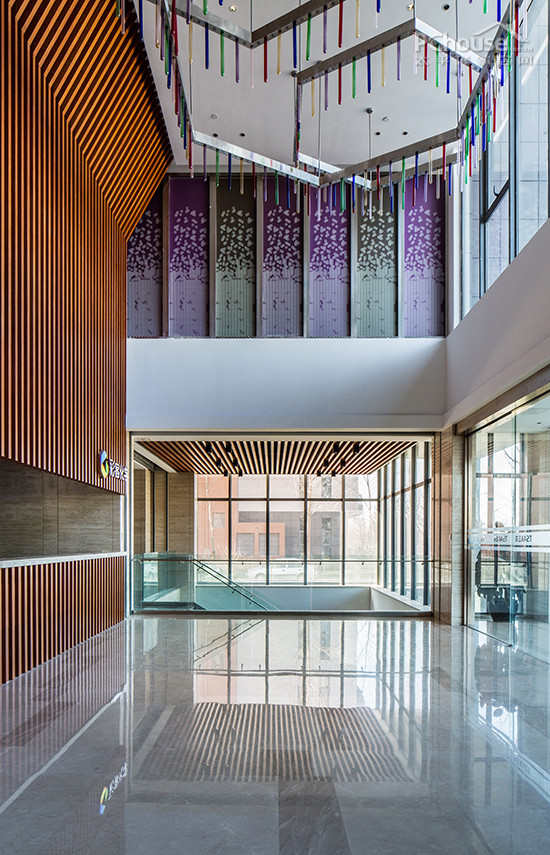 办公楼一层彩客化学LOGO镶在由长条木有序组合的装饰墙上。后面是方块拼合的世界地图,利用灯光产生了一种妙趣的光影关系。大幅世界地图寓意着企业走向世界的雄心,改变世界,联系世界,创造新的生活方式。左侧是大面积的绿植墙,通过人工合成光进行种植,衬托空间的生命气息,打造出室内景观,增加空间的舒适度。