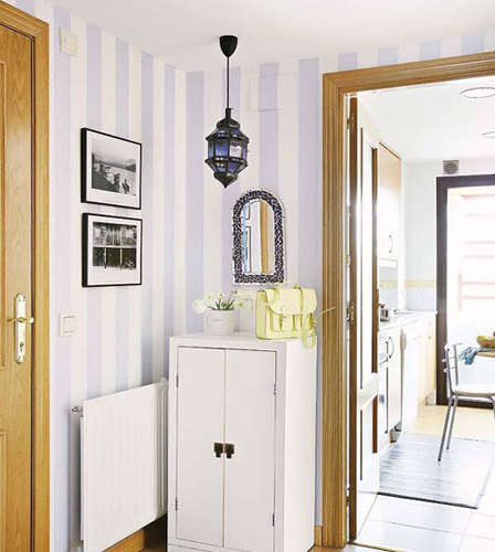 小编的话: 过厅的部分使用了紫色条纹的壁纸,料想是为了和门框做补色不硬,波西米亚式的小吊灯和简约的黑白装饰画靠的很近但是并没有产生相互的排斥,这里密密匝匝但是还好不显得太凌乱。