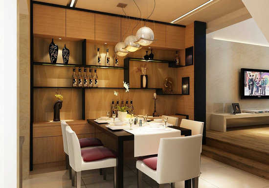 编辑点评:以铁件及木皮打造开放式展示柜,置上珍贵的水晶及收藏品,让位于财位的餐柜可聚收更多的财源好运。