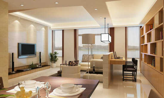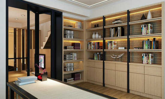 编辑点评:面宽甚广的客厅,设计者搭配矮墙用以划分书房,使空间感更见比例平衡之美。