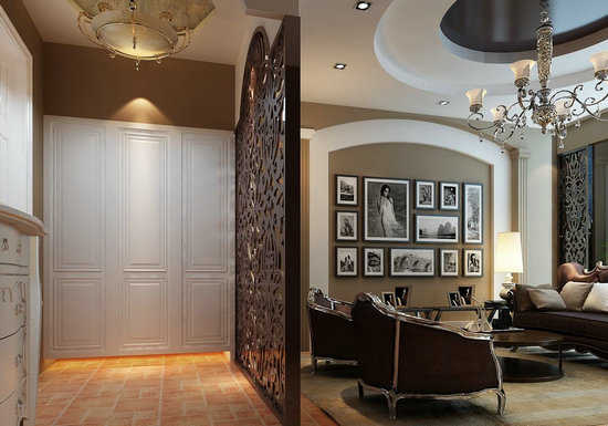 编辑点评:玄关雕花屏风的华丽度,延续至窗户的对称造型,一致的风格手法其实还有着隐藏窗帘的巧思。