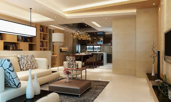 编辑点评:从电视墙延伸到墙面转折上天花板,斜面打光的设计,视觉效果十足。