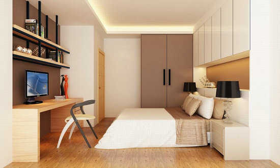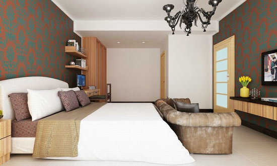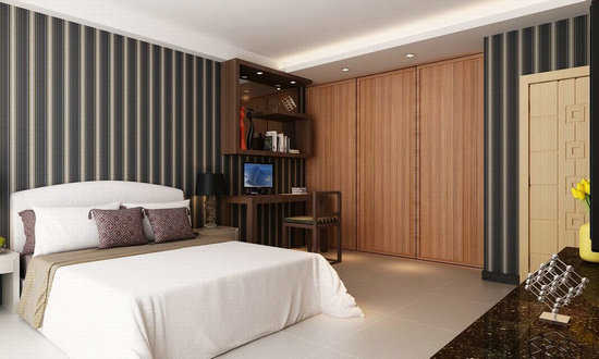 编辑点评:床头的背景墙设计突出低调奢华的一面,卧房内配有充裕的空间作衣物收纳用途。