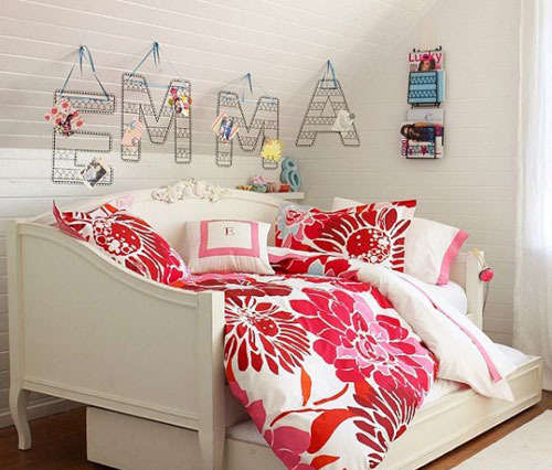 别具创意的设计,采用虚实结合的手法在墙面画上镂空的英文字母和丝带组合,使字母十分逼真。在丝带下挂上照片,起到了很好的展示作用。