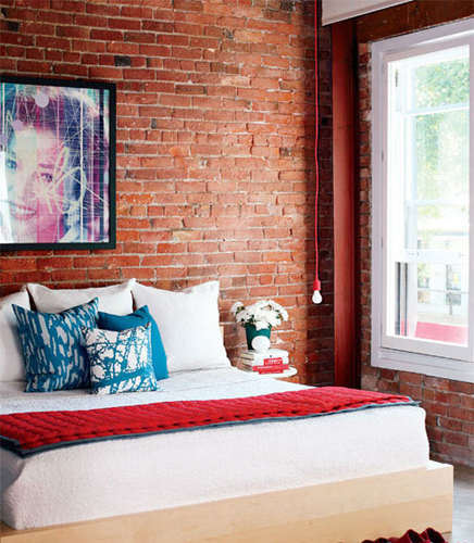 卧室的整个墙面都采用原始的红砖墙,带来了大自然泥土的气息,创造出一种古朴的质感。在墙上挂上一张明星的海报,给红色砖墙,带来了时尚感。红色的盖毯和红色的地毯,给房间增加了色彩。