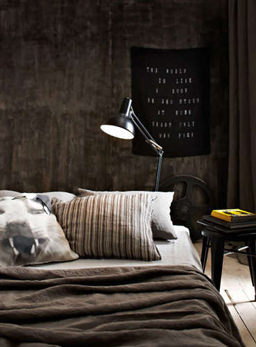 以深色木墙为墙面,装点上褐色的装饰画。搭配深色的床品。使整个空间弥漫着复古的韵味。 在墙壁一角的圆形饰物宛如工厂里的配件,使复古的氛围更浓郁。