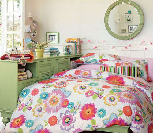 绿色的柜子、花朵的床品、绿色的床架,营造了田园式的卧室氛围。卧室背景墙采用了绿色圆形的镜子,扩大了空间视觉效果。墙面上粉红色的小花,使田园氛围更浓郁。