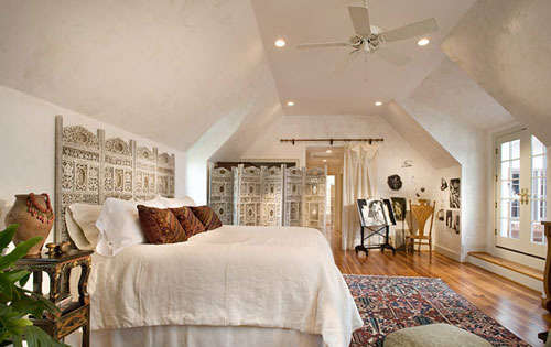 将家中的阁楼改造成卧室,采用两面屏风,一面屏风隔离休息区和工作区,一面屏风美化了卧室背景墙。乳白色的镂空花纹屏风,具有了中式的韵味。