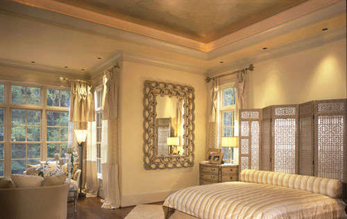 暖色调的主卧室,营造了温馨舒适的氛围。选用中式屏风作为卧室背景墙,给人以雅致美观之感。中式的屏风和欧式镜子,带来意想不到的视觉效果。