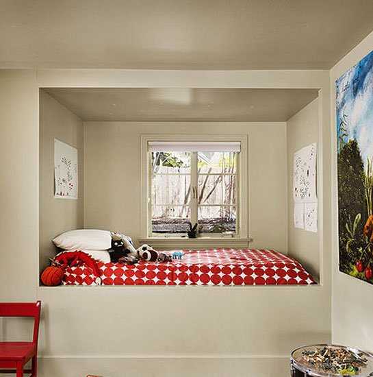 用水泥砌高并围起的窗边区域,是一款与房子连为一体的床架,窗虽然不大,但足以看到户外精致。这样的设计,让卧床区域更为宁静、隐私。灰色的墙壁,让软装的配色更游刃有余。出挑红色波点床品,与之形成反差,并有效活跃了空间气氛,更多的带有年轻色彩。