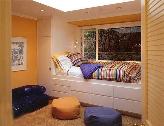可以说它是床,也可以说它是衣柜,窗台边的床架充斥着收纳空间,足以满足卧室独居者大大小小的衣服收纳。巧妙地将小空间打造成卧室。厚实的单人床垫给予身体足够的舒适。配色上采用紫色与黄色,并在条纹床品上得以融合。