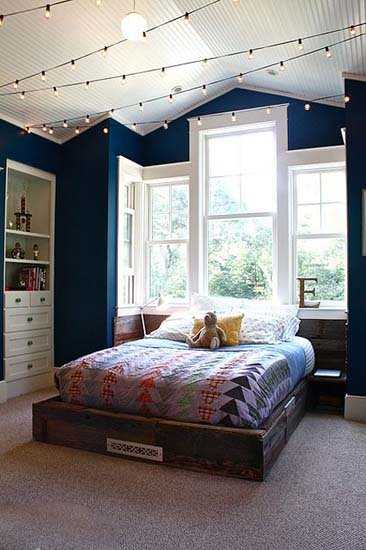与之前几款不同,这款床头靠窗打造的卧室,适合面积较大的人家。整个床头部分内嵌在飘窗区域,大大的窗体,抬头便能看到星空。窗下墙壁是与床架相同的古旧木板,别具一格。