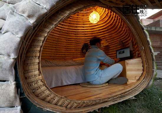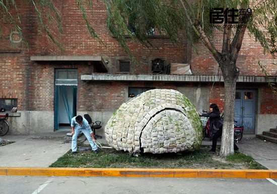 最近一件极具创意的作品通过网络而走红全球,这就是由24岁的戴海飞设计的蛋形蜗居。 这个蛋形可移动小屋真实的反应了北京日益高涨的房租。戴海飞是一名刚毕业半年的建筑 学院学生,最近几个月他就住在这个自己设计、制作的蛋形蜗居里。