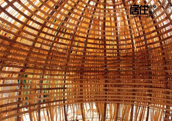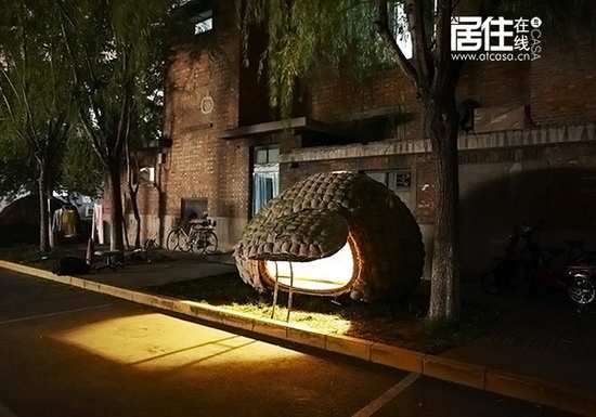 这个蜗居大概两米高,底部还装有两个轮子,可以移动,整体结构是用竹条编制而成。