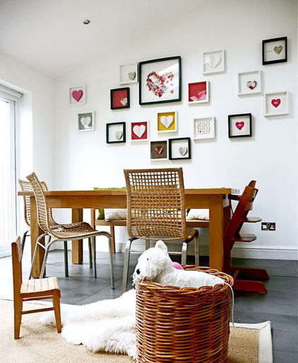 只在一面墙上组合悬挂图画吗?这里告诉你,可以在相邻的两面墙上同时采用这种方式哦!不过,因为图画数目较多,采用稍微整齐的方式摆放,便不易产生混乱的感觉。
