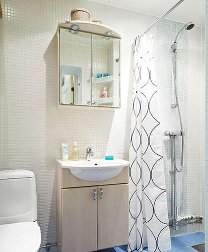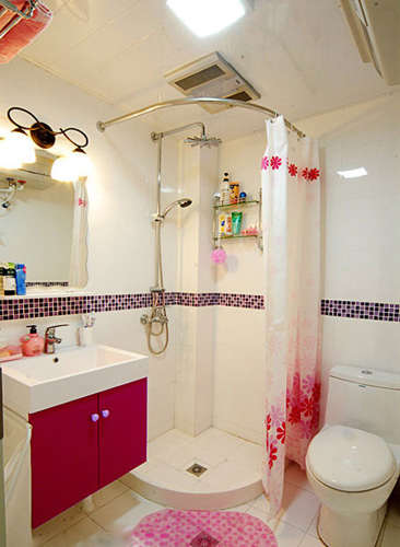 小编的话:清爽的色彩总是能提升空间的亮丽度。狭长的卫浴空间放下座便器以及小巧的台盆刚刚好,一边拦出一个小空间,挂上帘子就是淋浴区了。