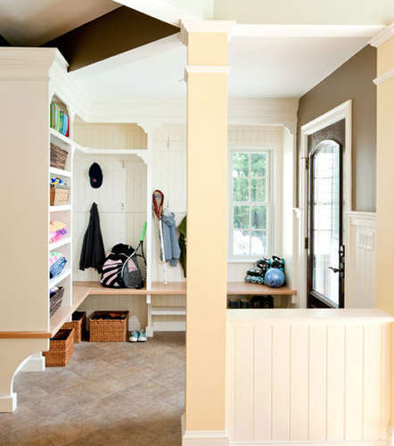 整个玄关区域被打造成了收纳功能十分强大的储物室, 而门一侧特设的隔断,高度上到墙的一半高,这样能让空间更为通透,又能起到划分作用,保持;两端区域应有的独立性。