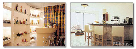 2、马蹄形吧台:也称为U形吧台,吧台凸入室内,一般要安排三个或更多的操作点,两段抵住墙壁,在U形吧台的中间,可以设置一个凹形储藏柜。