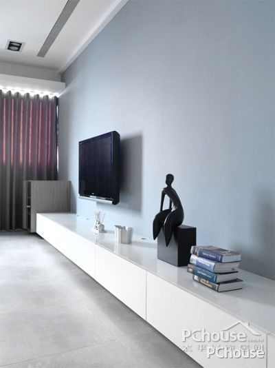 玄关柜体的线条凹凸不平,利用同材质同颜色的电视柜延伸视线,极富变化的线条,大面积浅蓝色墙面,也能顺利地将视线带到客厅,从而忽略玄关的狭窄感。