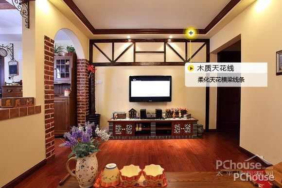 客厅本身有相对完整的横梁,打掉是不可能的,如果不做处理的话线条太过硬邦邦,所以可以在横梁衔接处,添加一层围石膏边造型,而上图设计师根据了整体的设计风格,选择木质天花线,增加了天花的装饰而又不会显得累赘。