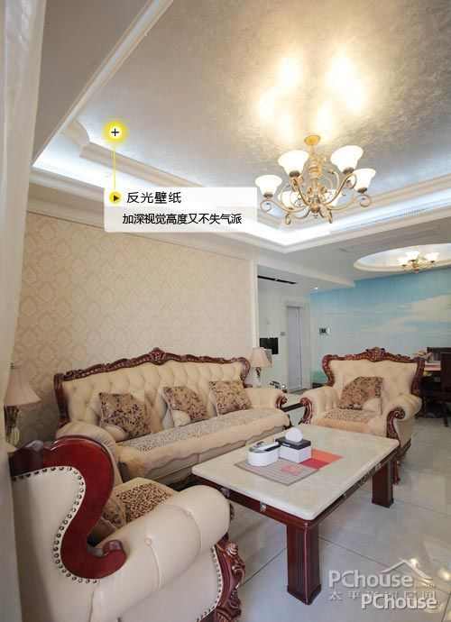 上图的这个设计案例,是为了配合屋内的简欧风格,做了比较大面积的封顶,虽然原则上小户型不建议3层以上的吊顶,但其中有一点是很值得小户型去学习的,就是具有反光特性壁纸的铺贴,加深视觉高度又不失气派。