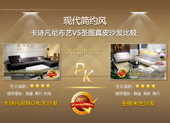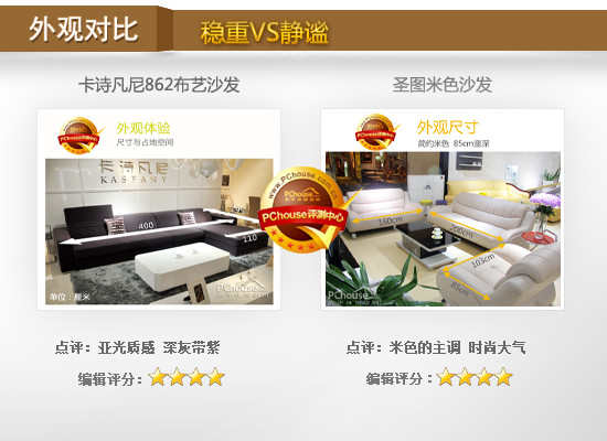 对比结果:卡诗凡尼862布艺沙发拥有布艺沙发特有的亚光质感,颜色是深灰色中带一点紫色,很难撞色,搭配方方正正没有曲线修饰的外形,非常稳重和谐。尺寸并不小,不适合小户型客厅,大概25~30平方左右的客厅会比较适合。而圣图真皮沙发采用米色的主调,没有纯白色的单调,却显出几分静谧的感觉。座深85cm,比一般的客厅沙发要小,在座深设计方面,不用添加抱枕也直接可以靠到背部,适合二十五平方左右的中型客厅。