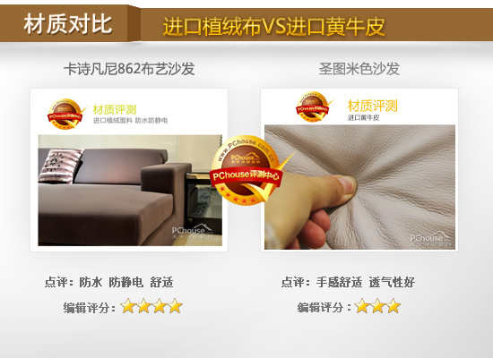 对比结果:卡诗凡尼这款布艺沙发采用进口植绒布的面料,有防水的功能,因此可以像真皮沙发一样直接用湿布抹。同时还有防静电的功能。而圣图真皮沙发采用进口黄牛皮,手感舒适,透气性好,平时直接用柔软的湿布擦拭便可。
