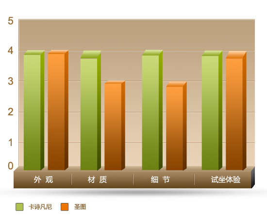 对比结果:卡诗凡尼沙发的可调节的靠背是另一个亮点。靠背的顶部可以手动调节,由金属支撑,可惜一共只有两个档位。如果将靠背放下就成了一款低靠背的沙发,拉起来之后可以把头靠着看电视。这个设计挺人性化,也比较时尚。圣图真皮沙发仅85cm的座深,没有抱枕也可以直接靠到背部,高密度棉的填充饱满,感觉到还是很舒适的,看来这款圣图沙发虽然在座深上做了功夫,但没有降低整体舒适度,反而节省了空间,但部分喜欢躺卧的人可能就有点不大如意了。