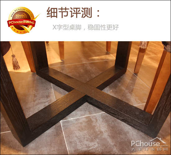 该餐桌是实木桌脚,实木桌脚相对来说会比较牢固,但是防潮性能会较差。这里需要注意餐桌椅摆放的位置,最好容易潮湿的地方有一定的距离。另外餐桌的桌脚是X字型的,这样会使餐桌更加的稳固。
