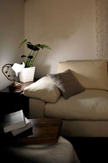 装饰Tips:沙发后面的墙壁采用硅藻土完成,在形似花朵的复古款式照明灯下,呈现出美丽的图案阴影。柔和的灯光下,舒适的沙发,喜欢的读物,生活变得温馨又惬意。