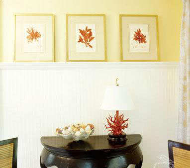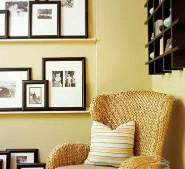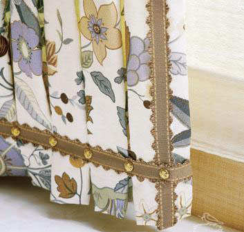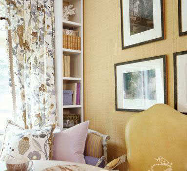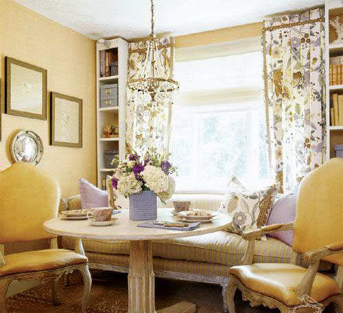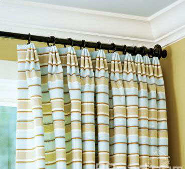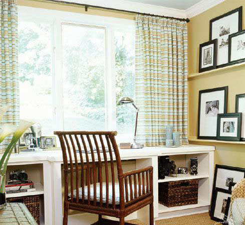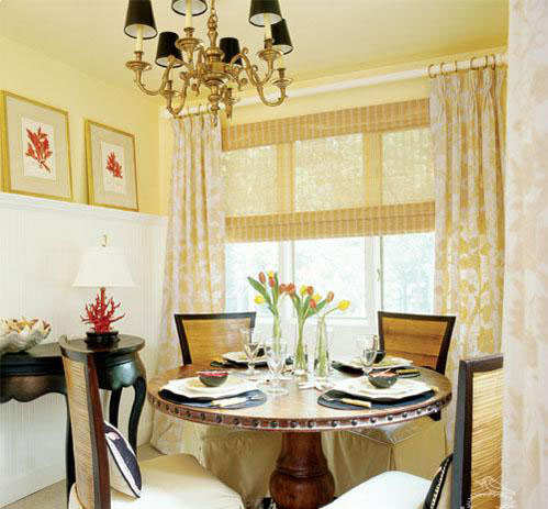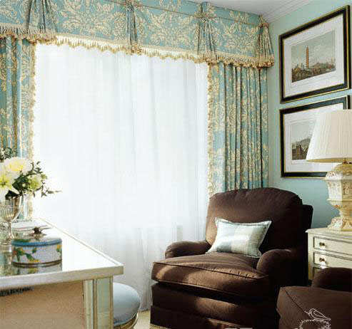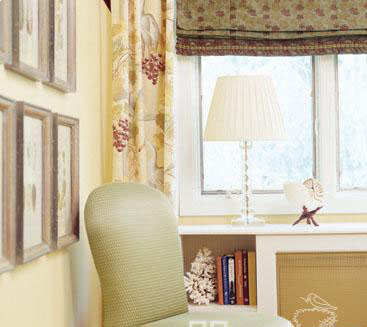窗帘:因为是休闲区,所以在窗帘的选择上应该以自然舒适的纯棉材质为主,其良好的透气性能会更加舒适。因为这个空间的整体色调是以黄色为主,所以窗帘可以选择绚丽的大花朵图案,可以让休闲区的这扇窗户更加多姿多彩,同时也能让你更加放松。为了能搭配更加和谐,你还可以用窗帘剩下的布料做成靠包来装点沙发。黄铜钉在带褶皱的窗帘上起到了双重作用,它很好地固定住了顶部的丝带饰边,从而起到了不错的装饰作用。另外,包合在底部的黄铜钉还可以把一些金属器件掩藏起来。在安装窗帘时,要与窗户之间留有一定的距离,这样才能保证窗户下面的遮光性。